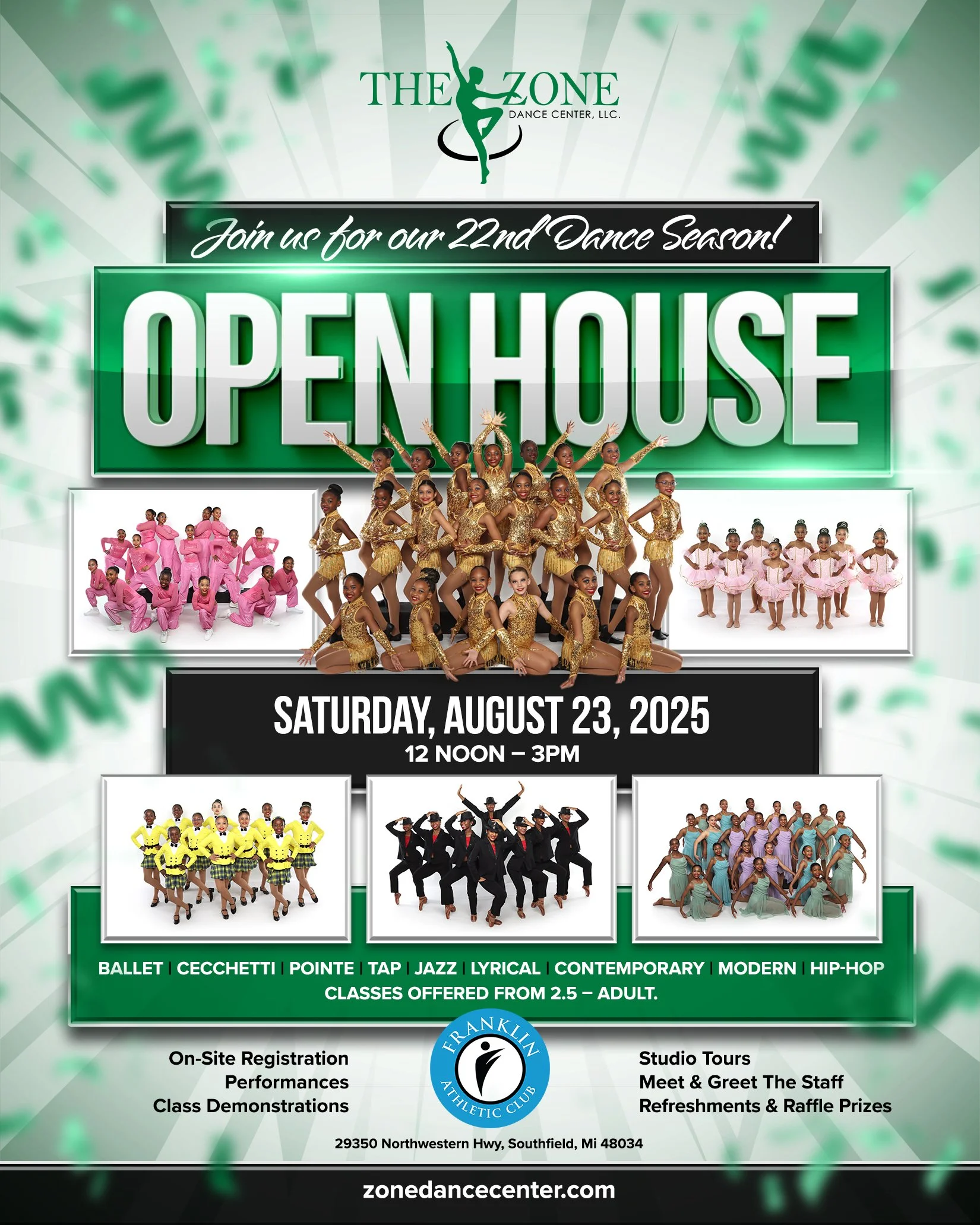 10:30 am -12:30 pm: Lyrical I, Ballet I, Tap I, Jazz I, Hip Hop I